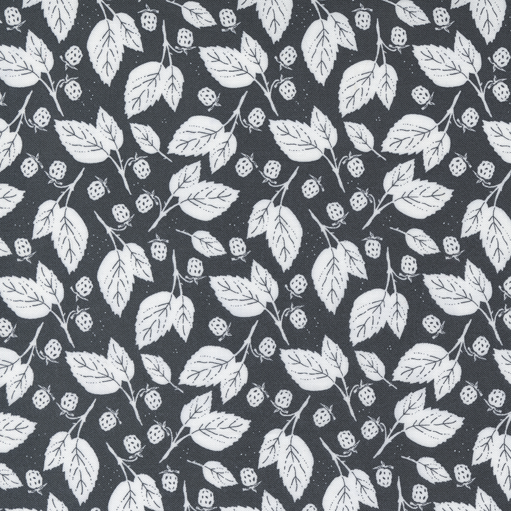 Midnight In The Garden designed by Sweetfire Road for Moda. As the sun sets over a cottage garden, the bright day’s sky slowly turns to the soft blush and gold shades of twilight. The night air is scented with fresh earth, ripe berries and sweet apples, and as midnight arrives, the garden is transformed into a strikingly beautiful stillness coloured in shades of charcoal and moonlight. It is a peaceful place of quiet repose and magic, a lovely contrast to the busyness of the day.