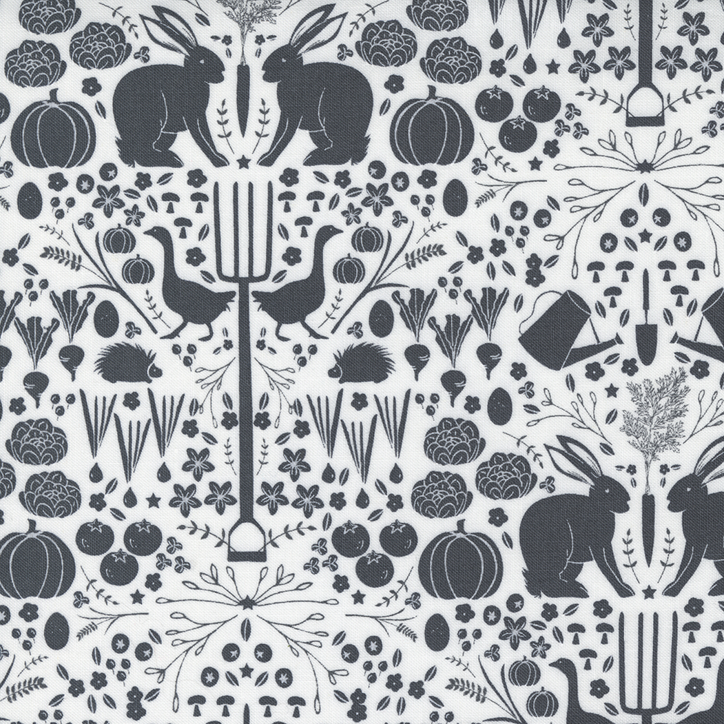 Midnight In The Garden designed by Sweetfire Road for Moda. As the sun sets over a cottage garden, the bright day’s sky slowly turns to the soft blush and gold shades of twilight. The night air is scented with fresh earth, ripe berries and sweet apples, and as midnight arrives, the garden is transformed into a strikingly beautiful stillness coloured in shades of charcoal and moonlight. It is a peaceful place of quiet repose and magic, a lovely contrast to the busyness of the day.