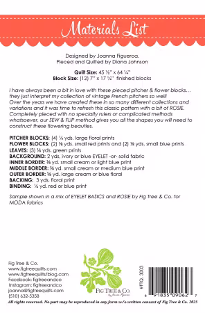 I have always been a bit in love with these pieced pitcher & flower blocks… they just interpret my collection of vintage French pitchers so well! Over the years we have created these in so many different collections and variations and it was time to refresh this classic pattern with a bit of ROSIE. Completely pieced with no specialty rulers or complicated methods whatsoever, our SEW & FLIP method gives you all the shapes you will need to construct these flowering beauties. Quilt Size: 45 1/2″ x 61″