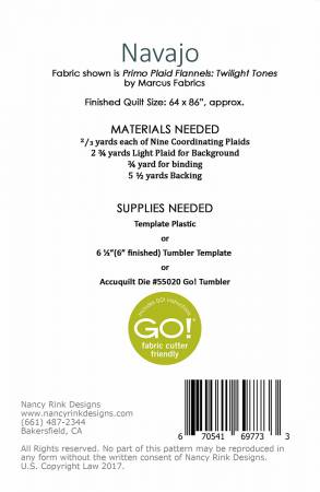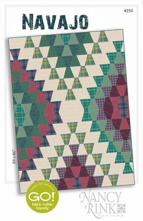 Navajo, finished size: 64in x 86in, is an easy to make quilt. Pattern features cutting for both traditional and AccuQuilt Go! cutting system. Pattern cover version is made with plaid flannels, but it looks great in prints and solids, too!