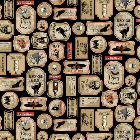 Fun Halloween-themed fabric with lots of spooky vintage labels.