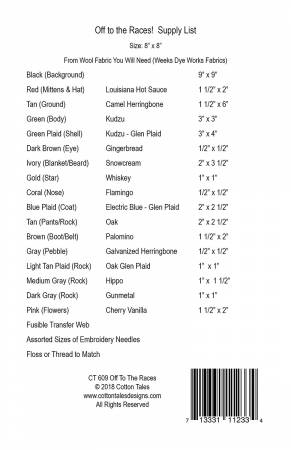 Off to the Races is made with wool applique and measures 8in x 8in. It’s a perfect little size to frame, or hang. You can stitch it to a larger piece of wool, or add sashing to make it bigger, if you like.