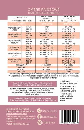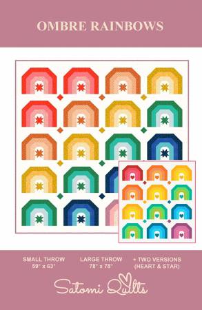 The OMBRE RAINBOWS quilt is traditionally pieced and is recommended for advanced beginner quilters and up. The pattern includes step-by-step instructions with many diagrams for two versions (Heart and Star), and each version includes two sizes: a small throw (59” x 63”) and a large throw (78” x 78”). It also includes the cutting table for a single block. The finished block size is 12″ x 16″.