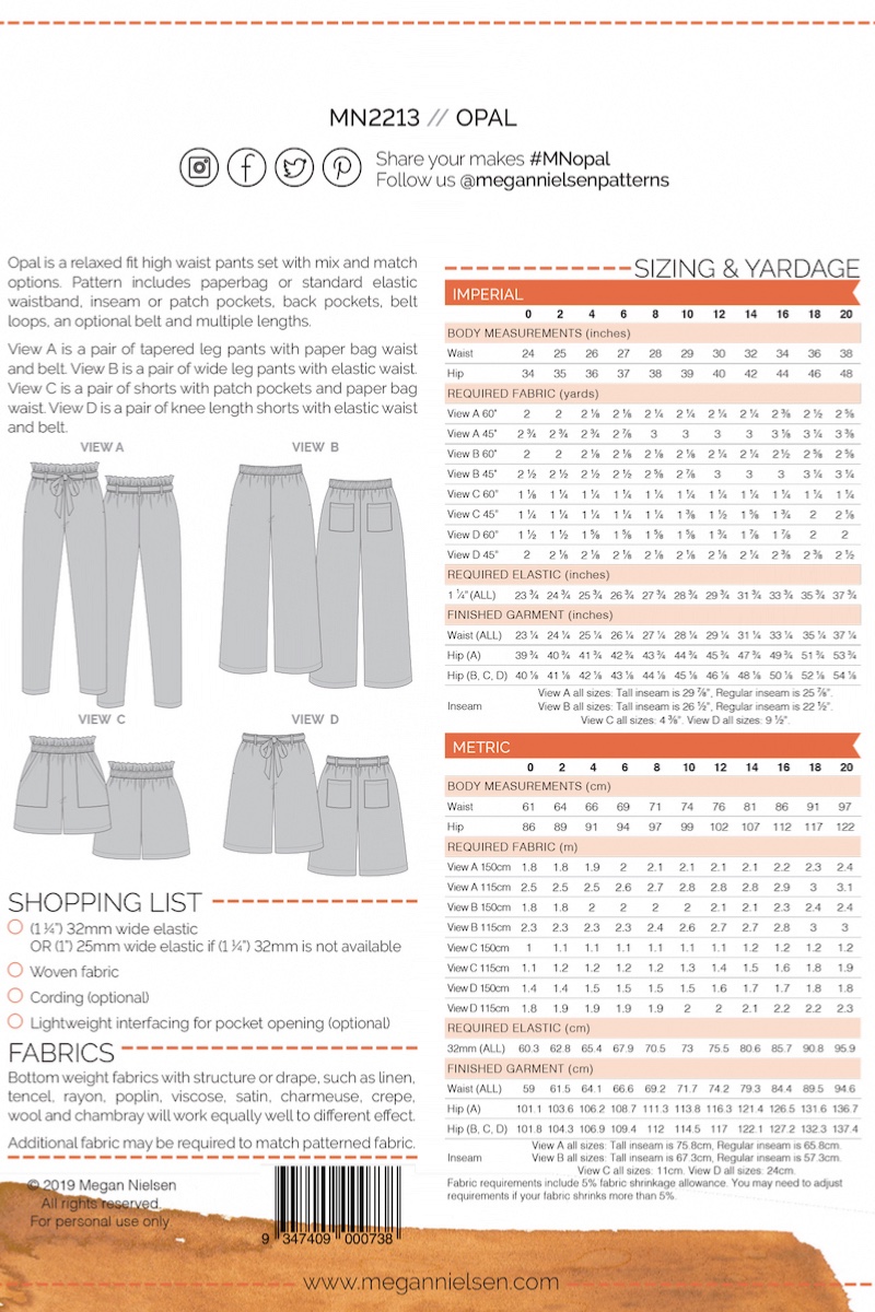 Opal is a relaxed fit high waist pants set with mix and match options. Pattern includes paperbag or standard elastic waistband, inseam or patch pockets, back pockets, belt loops, an optional belt and multiple lengths. View A is a pair of tapered leg pants with paper bag waist and belt. View B is a pair of wide leg pants with elastic waist. View C is a pair of shorts with patch pockets and paper bag waist. View D is a pair of knee length shorts with elastic waist and belt.