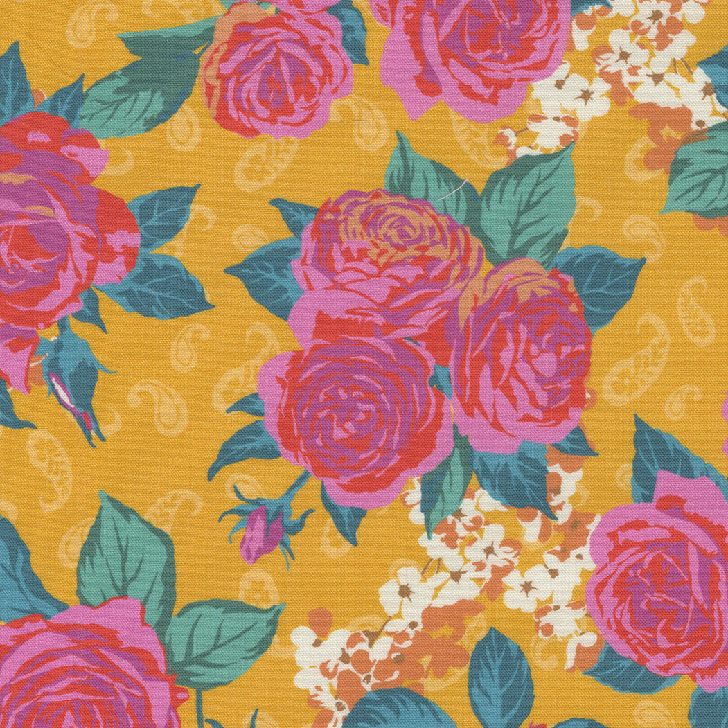 Paisley Rose by Crystal Manning for Moda Fabrics. Blooming roses add a dash of romance and ornate paisleys create a bohemian vibe. The luscious colours and vibrant patterns of Paisley Rose will add boho-style to all your projects!