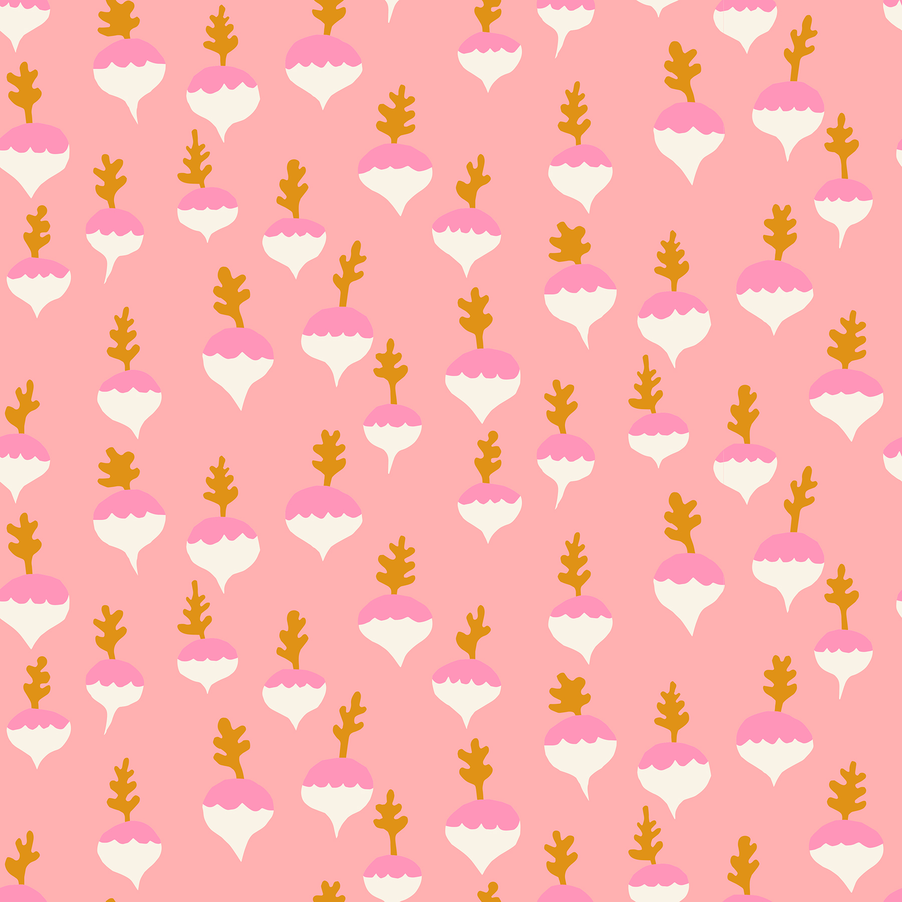 Kim Kight was inspired by a trip to the International Folk Art museum in Santa Fe. Petunia has a distinctly folk-art vibe with florals arranged in a fixed geometric layout and other designs arranged more loosely with motifs tossed on the background. The colour pallet is light an fresh like a sunny day.