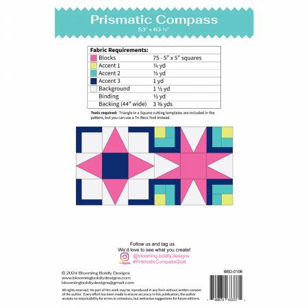 May you find that any direction is the right direction with the Prismatic Compass Quilt by Leslie Ryan of Blooming Boldly Designs. 5″ square friendly. Finished size is 53″ x 63 1/2″. Traditional piecing methods, includes paper templates for the triangle in a square units. Even thought templates are included a Tri-Recs or Triangle-in-a-Square ruler is recommended for ease of cutting.