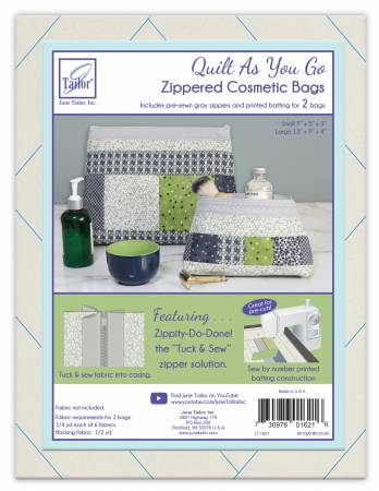 Quilt As You Go Zippered Cosmetic Bags which includes pre-sewn zippers and printed batting for 2 bags – one large and one small. Featuring our new Zippity-Do-Done™ “tuck and sew” zipper solution. Large bag measures 13” x 9” x 4” and small bag measures 9” x 5” x 3” when finished.