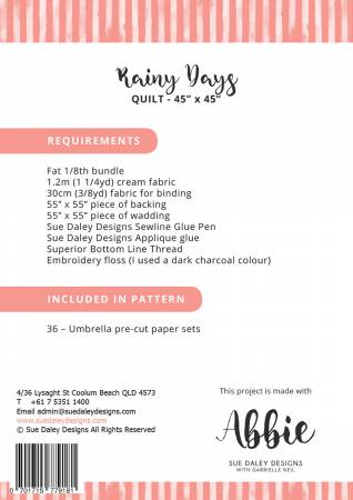 Rainy Days Quilt is made using Sue Daley Designs *NEW* Umbrella pre-cut papers. Fussy cut your favorite fabric to feature in this quilt. Pattern cover sample uses ‘Abbie’ collection by Sue Daley Designs & Gabrielle Neil for Riley Blake Designs.