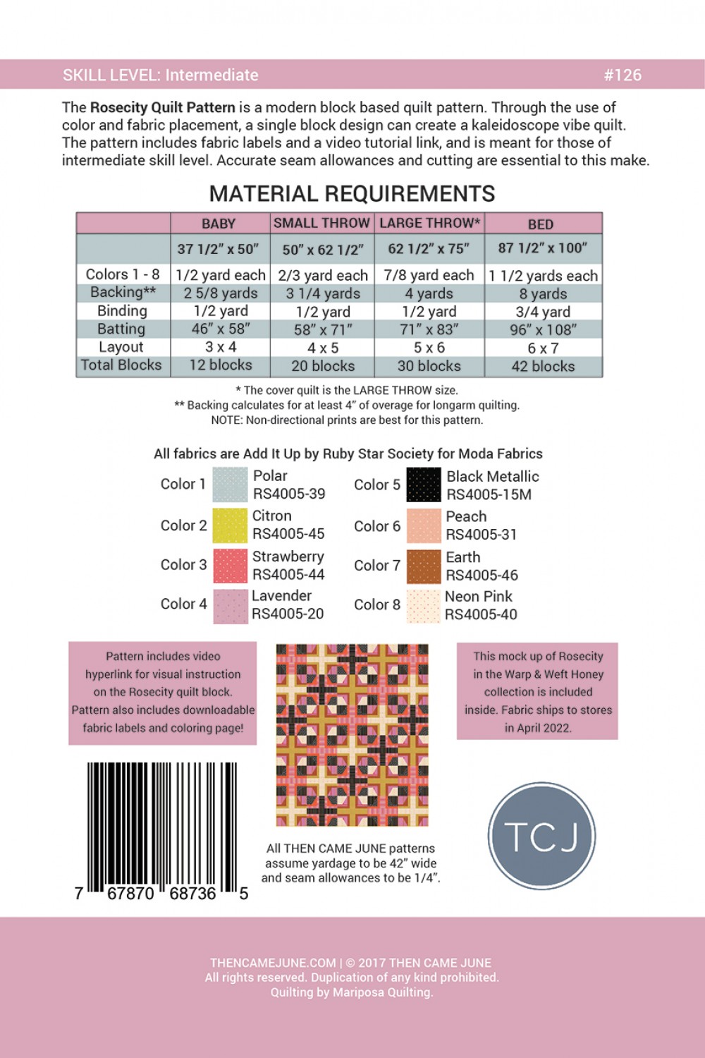 The Rosecity Quilt Pattern is a modern block based quilt pattern. Through the use of colour and fabric placement, a single block design can create a kaleidoscope vibe quilt. The pattern includes fabric labels and a video tutorial link, and is meant for those of intermediate skill level. Accurate seam allowances and cutting are essential to this make.