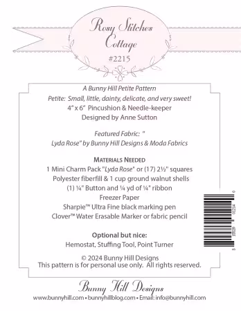 A Bunny Hill Petite Pattern. 4” x 6” Pincushion & Needle Keep. Mini Charm friendly! You can make this pincushion in an afternoon. The front door opens to hold your needles.