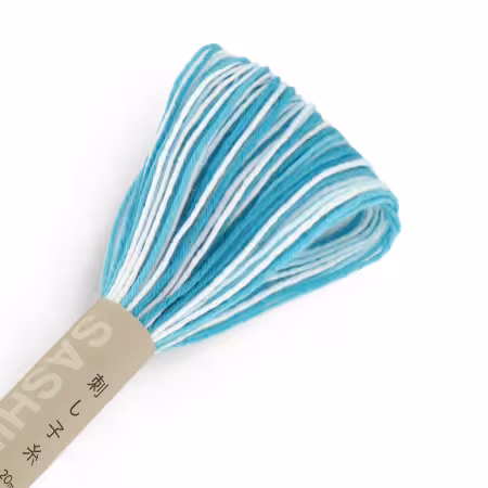 Variegated Turquoise Sashiko thread by Olympus of Japan is 100% cotton. This is the most popular Sashiko thread, a lighter weight, similar to perle cotton #8. New 22 yard skein.