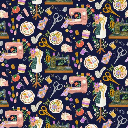 Sew Beautiful by Olivia Gibbs for Timeless Treasures, this cotton print fabric features sewing machines, mannequins, scissors and more