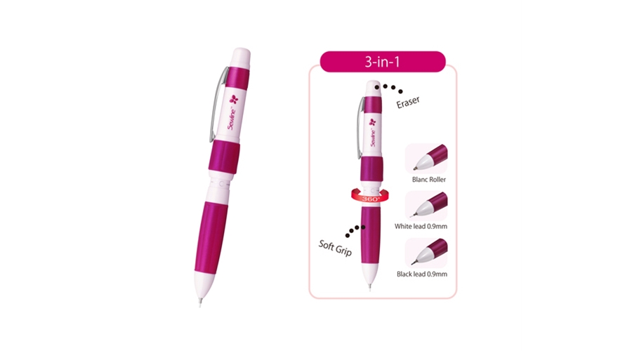 A fabric pencil with a unique 360 degree rotating mechanism for three functions in one.