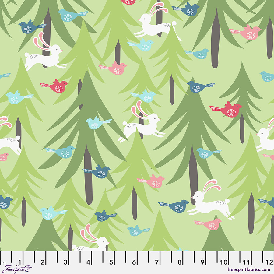 The Snowy Weather flannel collection from Penn2Paper’s Sue Penn Designs for FreeSpirit Fabrics. Features whimsical deer, trees, bunnies, and birds in soft, bright colours.