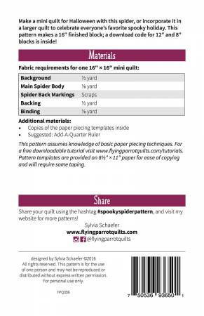 This 16in x 16in foundation paper pieced mini quilt is perfect for Halloween lovers! Make it as a wall-hanging or pillow, or include it in a larger quilt. Customers will find a download code for two additional sizes of spider paper piecing templates inside the pattern. Knowledge of basic paper piecing techniques is assumed. All foundation paper piecing templates are provided on 8-1/2in x 11in paper for ease of copying.