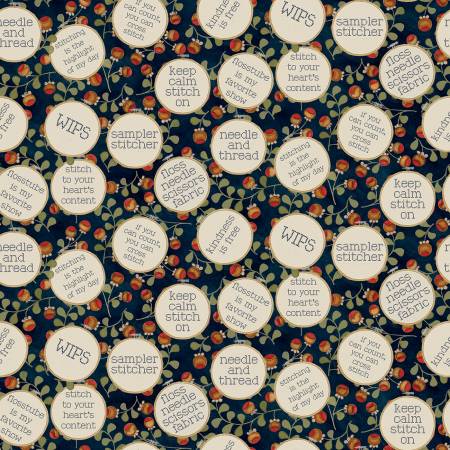 Stitchy Birds By Teresa Kogut for Riley Blake. Beautiful cross-stitching birds and their tools are just the beginning of this collection. Blue, butterscotch, green, midnight, and parchment make a gorgeous palette for the florals, embroidery hoops, stitches, and more.
