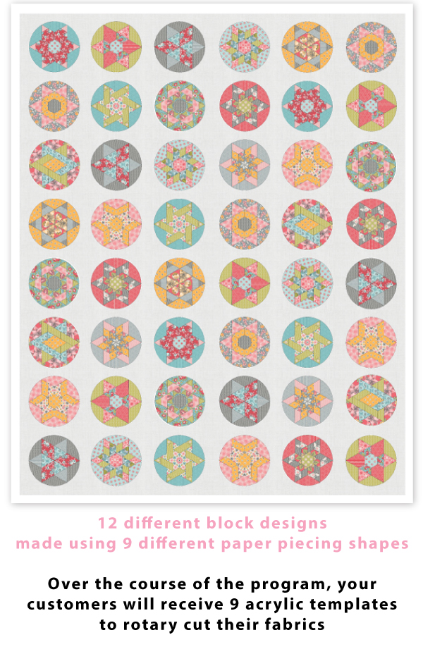 All the templates and Paper Pieces you need to make Sue Daley’s beautiful Round We Go Quilt.
