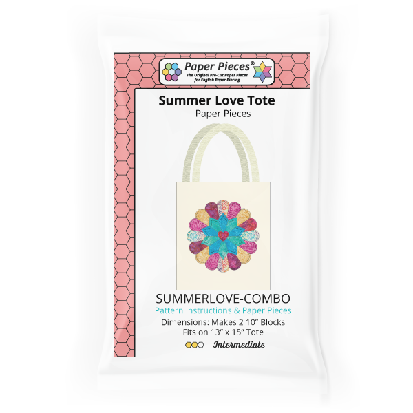 Show off your love of summer and quilting with this easy and fun tote bag. Featuring a double bloom flower on both sides with a heart in the center, this is a quick and simple project. Using a standard size, ready-made tote (not included) and a combination of EPP, applique and big stitch hand quilting, you can finish this project in just a few hours.