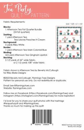 It’s time for tea! This darling Tea Party quilt is made up of an assortment of teacups and teapots, all on sweet shelves. This quilt is fat quarter friendly and so fun to sew! Beverly McCullough will be hosting a sew along with this pattern in January 2024. Quilt Size: 63” x 80” Blocks: 1 Afternoon Tea Fat Quarter Bundle (24 fat quarters) Sashing: 1 yard Afternoon Tea Tea Leaves Peaches N Cream Background: 5 yards Riley White Border: 1 yard Afternoon Tea Main Colonial Blue Binding: 3/4 yard Afternoon Tea Gingham Lipstick Backing: 5 1/2 yards of 44” wide fabric, or 2 1/2 yards 108” wide fabric