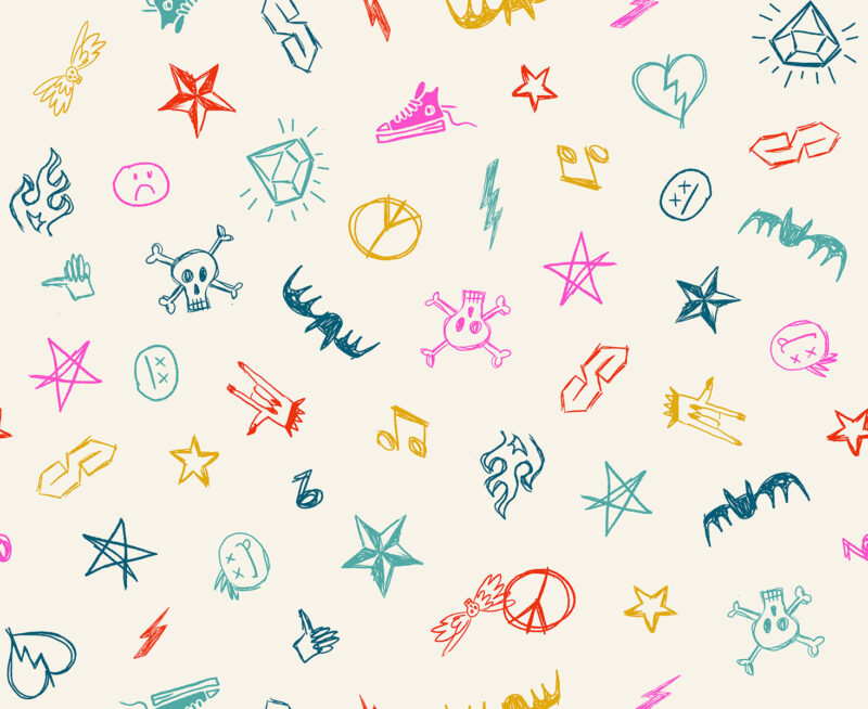 The Teddy and the Bears collection designed by Sarah Watts for Ruby Star Society. The Teddy and the Bears fabric collection is a melting pot of cute teddy bears and punk rock. This collection features bears, instruments, stars and lightning bolts in blue, black and neon pink.