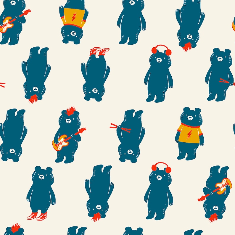 The Teddy and the Bears collection designed by Sarah Watts for Ruby Star Society. The Teddy and the Bears fabric collection is a melting pot of cute teddy bears and punk rock. This collection features bears, instruments, stars and lightning bolts in blue, black and neon pink.