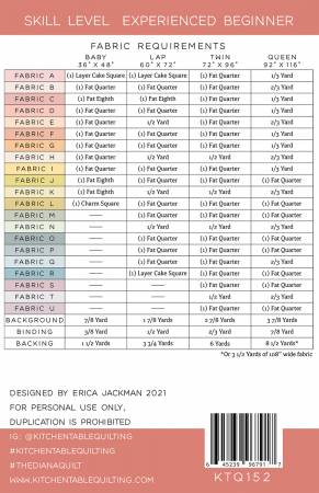 The pattern has instructions for baby size (36″ x 48″), lap size (60″ x 72″), twin size (72″ x 96″), and queen size (96″ x 116″) quilts.