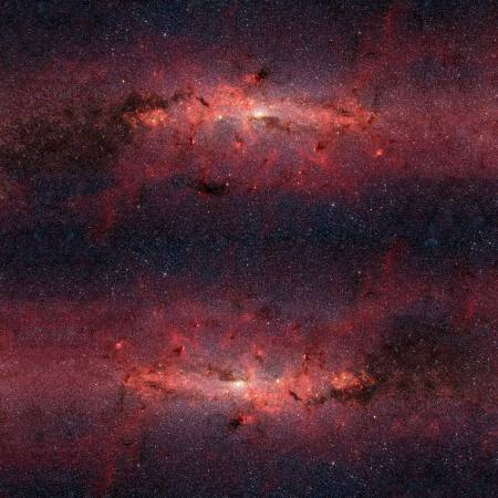 The center of our Milky Way galaxy is hidden from the prying eyes of optical telescopes by clouds of obscuring dust and gas. But in this stunning vista, the Spitzer Space Telescope’s infrared cameras penetrate much of the dust, revealing the stars of the crowded galactic center region. By RJR Fabrics