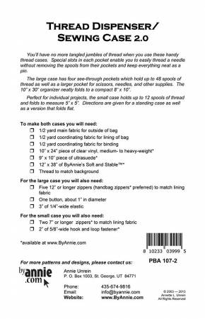 Patterns By Annie’s Thread Dispenser/Sewing Case II contains instructions for two sizes of organizers. The 10in x 30in Organizer folds to a compact 8in x 10in, holds up to 48 spools of thread and has a larger pocket. The small 5in x 5in Organizer is perfect for individual projects. It holds up to 12 spools and folds to 5in x 5in . Directions are given for standing case and one that folds flat.