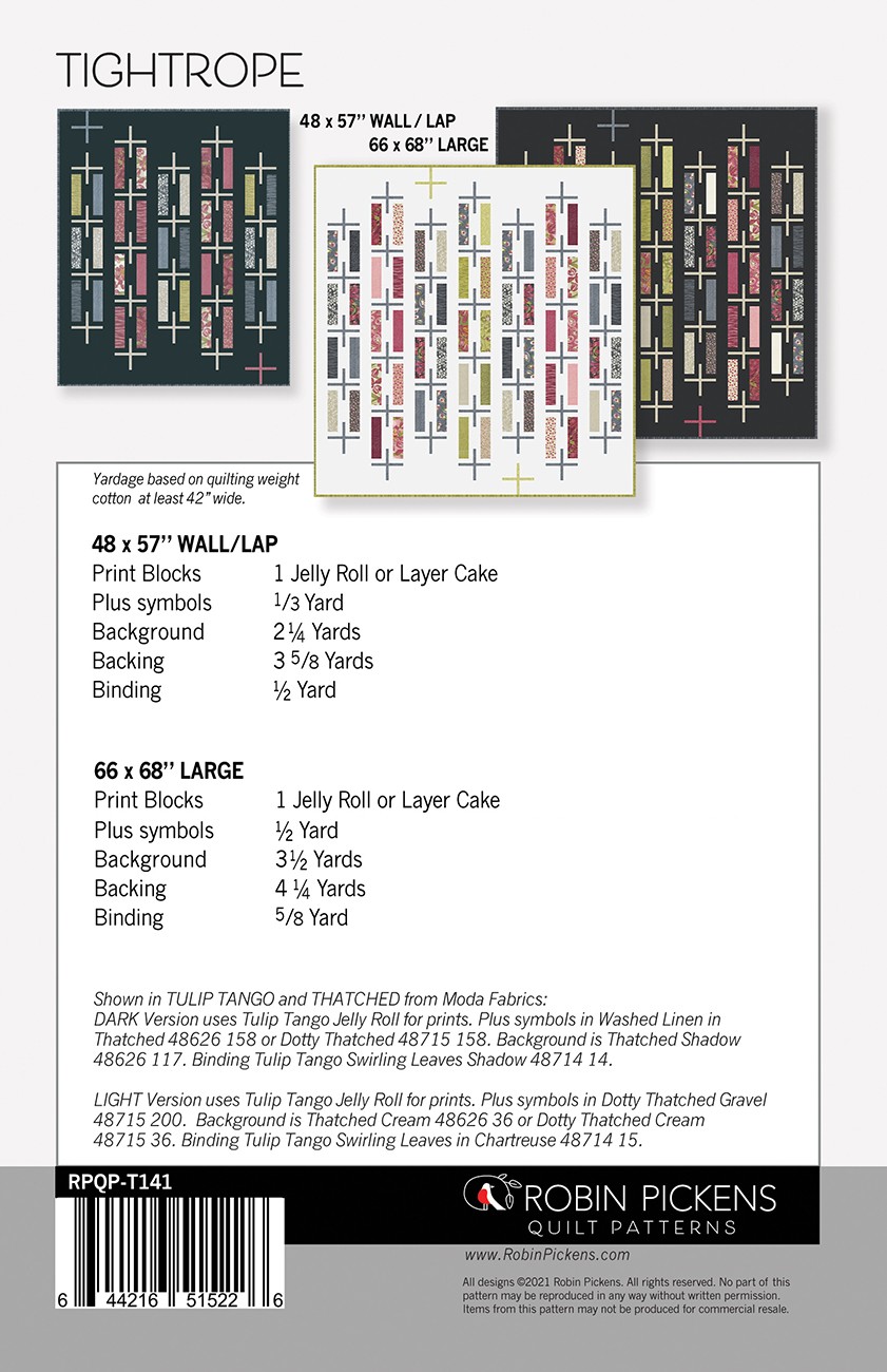 Tightrope uses jelly roll 2.5in strips to make a line up of rectangles with arms stretched out for balance in space. Accent plus blocks add more colour into the borders of the quilt. Two sizes of wall/lap or large quilt in pattern.