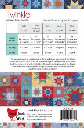 Twinkle combines simple star blocks to make an eye catching quilt. The pattern is fat quarter or yardage friendly, and includes 5 unique layouts for each size that give the stars a random look. There are no tricky seams, and this quilt is suitable for an intermediate to advanced beginner.