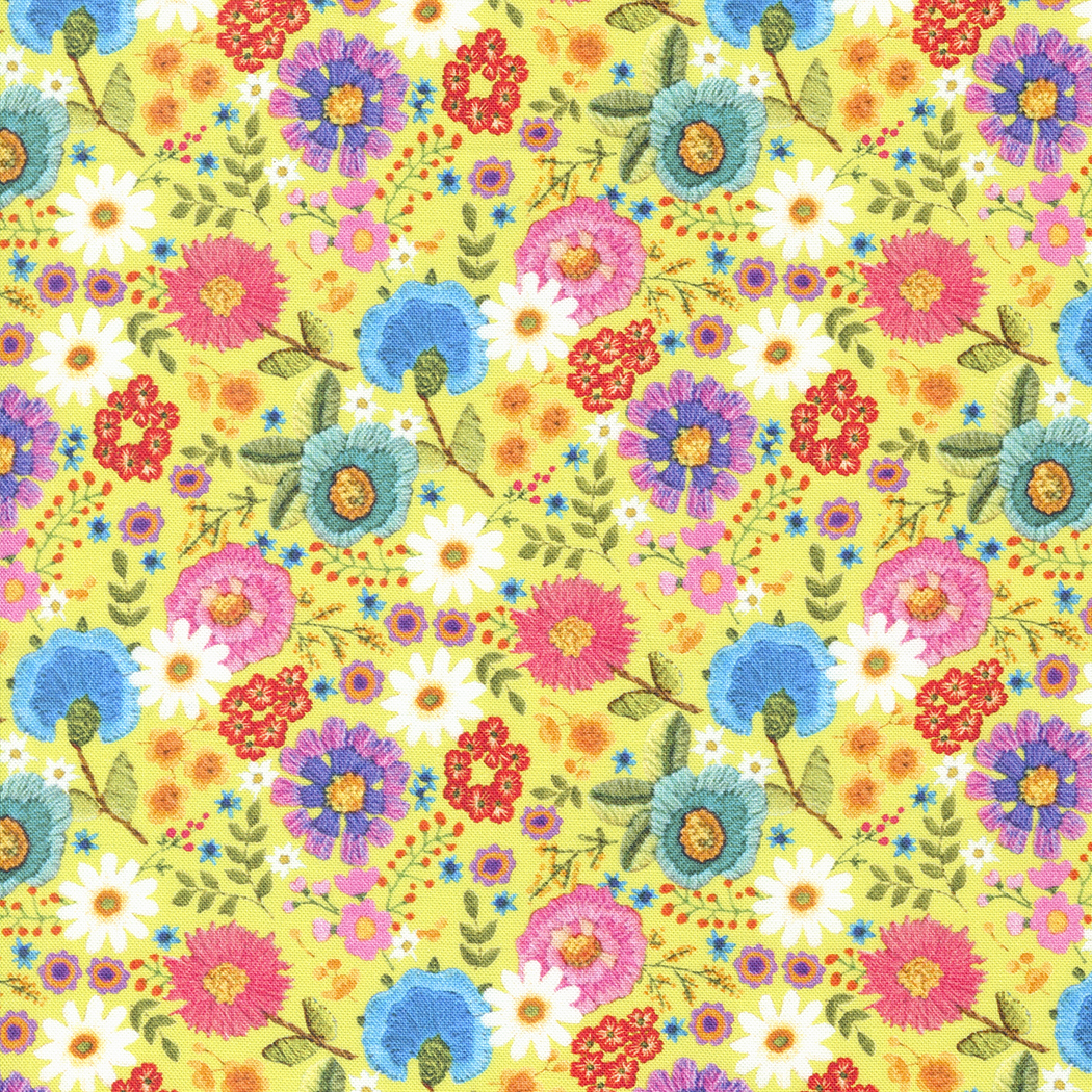 Discover embroidered and crewel-stitched flowers, birds, and sweet repeats in the bright colours of happy in this exciting collection inspired by craft kits of the 60s and 70s. Cathe reproduced her nostalgic batch of crocheted potholders & hot pads into delightful prints, and created a rainbow-esque cheater-quilt design derived from her treasured mid-century patchwork throws. Projects of all shapes and sizes become extra cheerful with Vintage Soul fabrics!