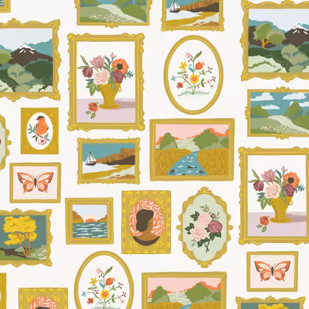 This enchanting fabric showcases a delightful gallery of framed artworks, each capturing the essence of nature and beauty. From serene landscapes to vibrant floral arrangements and delicate butterflies, the design is framed in elegant gold, creating a sophisticated yet whimsical aesthetic. Perfect for quilters and fabric enthusiasts, this wide-back fabric offers a unique canvas for large projects, ensuring your creations stand out with its detailed and charming illustrations.