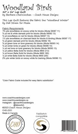 Makes a 40″ x 56″ winter quilt featuring rows of pieced snowflakes, cardinals, chickadees, trees, wreaths and stars. Definitely will become a family favourite. Features Woodland Winter by Deb Strain.