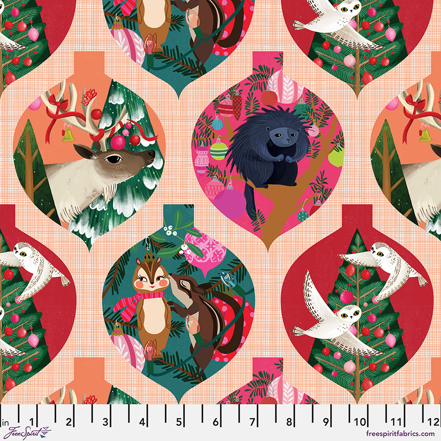 The Woodland Holiday fabric collection designed by Katy Tanis for FreeSpirit Fabrics. “In Woodland Holiday, camouflaged snowy critters traverse winter landscapes to gather in an evergreen forest and celebrate the winter holidays. A polar bear shares a cup of cocoa with a titmouse. A snowy owl delivers gifts. Cheeky lemmings munch candy canes. And chipmunks scurry across strings of holiday lights. Vintage ornaments and piles of gifts add to the festivities.”