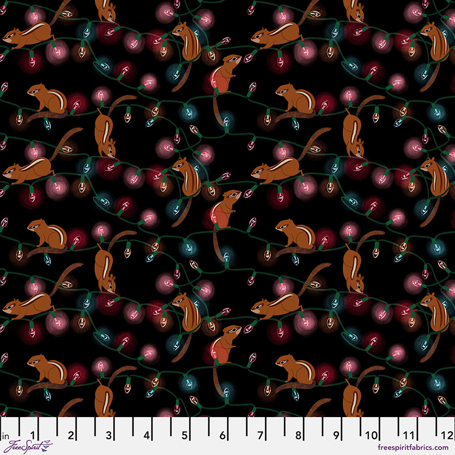 The Woodland Holiday fabric collection designed by Katy Tanis for FreeSpirit Fabrics. “In Woodland Holiday, camouflaged snowy critters traverse winter landscapes to gather in an evergreen forest and celebrate the winter holidays. A polar bear shares a cup of cocoa with a titmouse. A snowy owl delivers gifts. Cheeky lemmings munch candy canes. And chipmunks scurry across strings of holiday lights. Vintage ornaments and piles of gifts add to the festivities.”