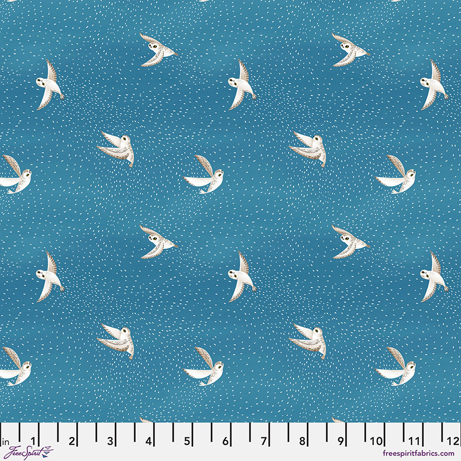 The Woodland Holiday fabric collection designed by Katy Tanis for FreeSpirit Fabrics. “In Woodland Holiday, camouflaged snowy critters traverse winter landscapes to gather in an evergreen forest and celebrate the winter holidays. A polar bear shares a cup of cocoa with a titmouse. A snowy owl delivers gifts. Cheeky lemmings munch candy canes. And chipmunks scurry across strings of holiday lights. Vintage ornaments and piles of gifts add to the festivities.”