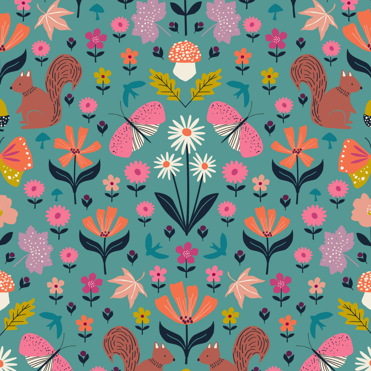 Escape into an Autumnal Woodland with these charming prints featuring swooping birds, dancing squirrels and pretty wild blooms in a rich, earthy palette perfect for Fall sewing.